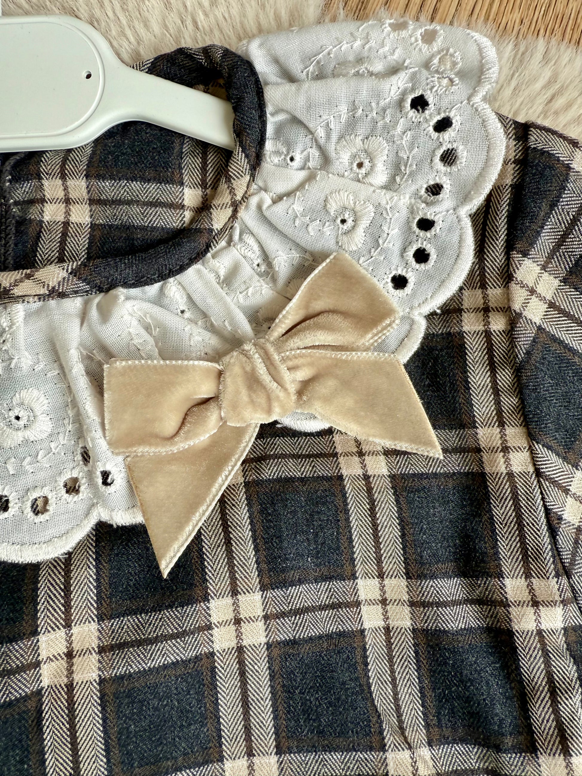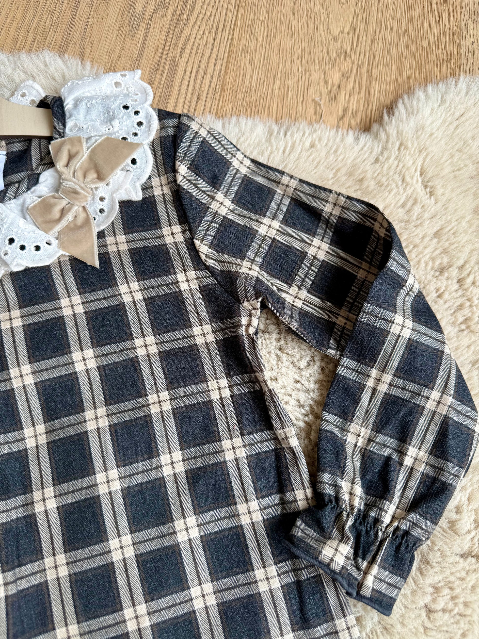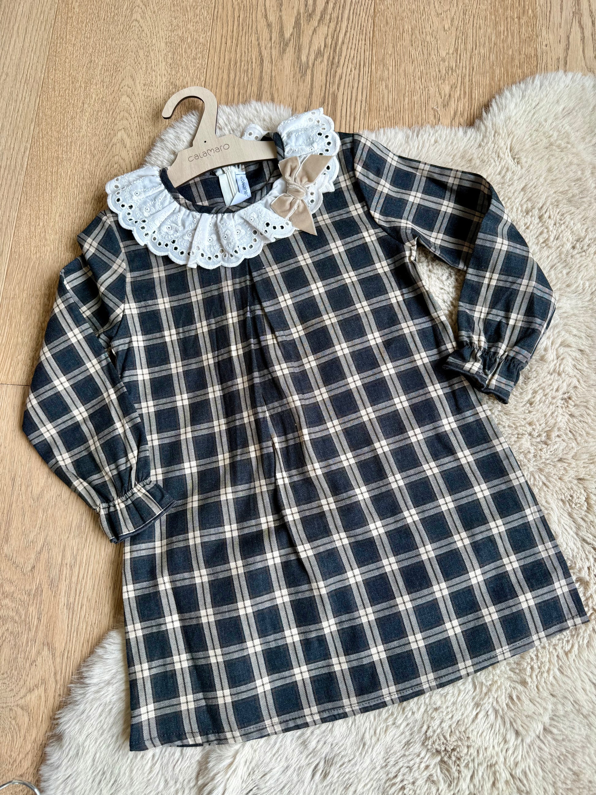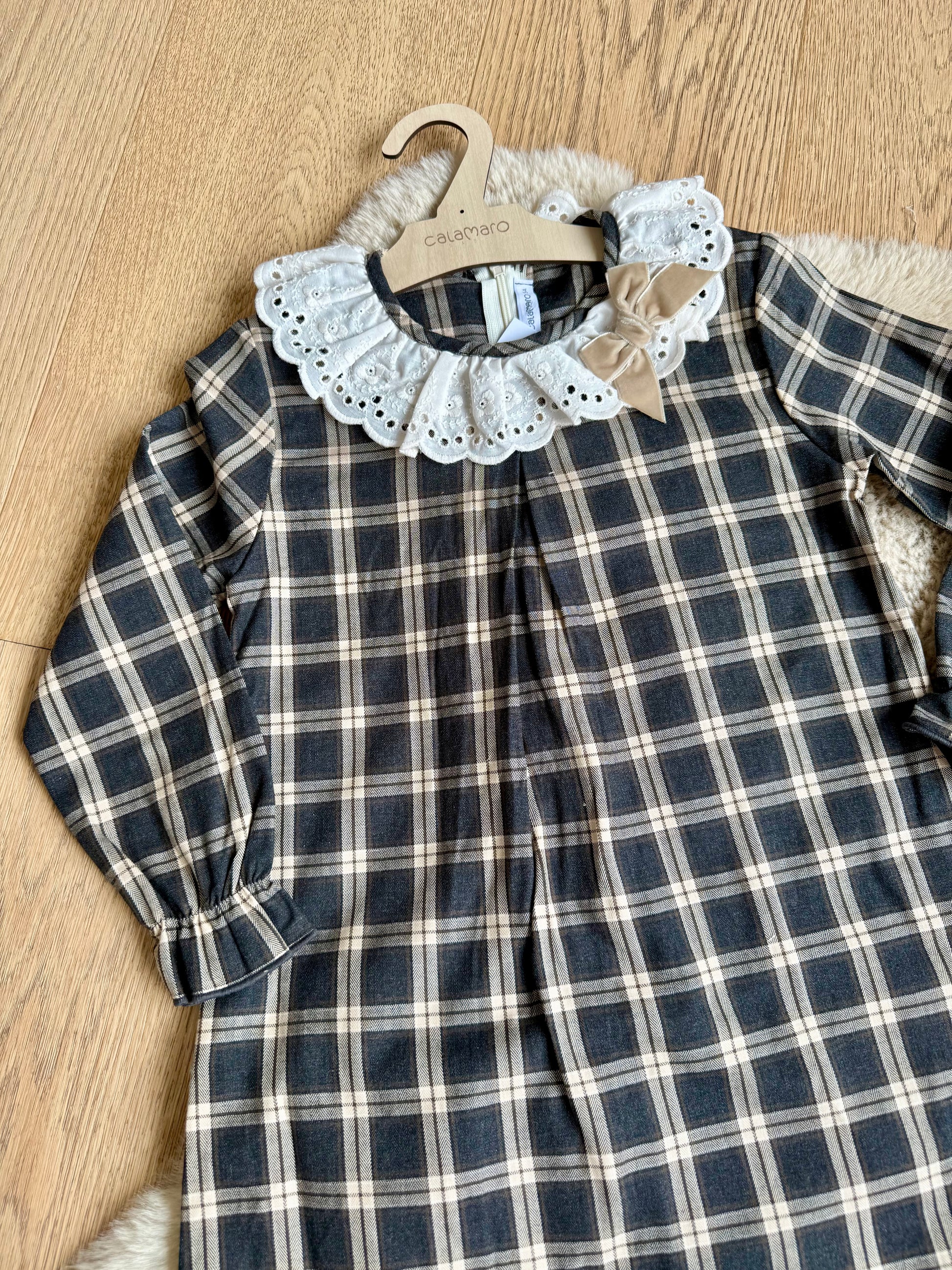 Deze elegante jurk combineert tijdloze klasse met een speelse toets dankzij het subtiele motief. De witte kraag en strik zorgen voor een verfijnde afwerking.
